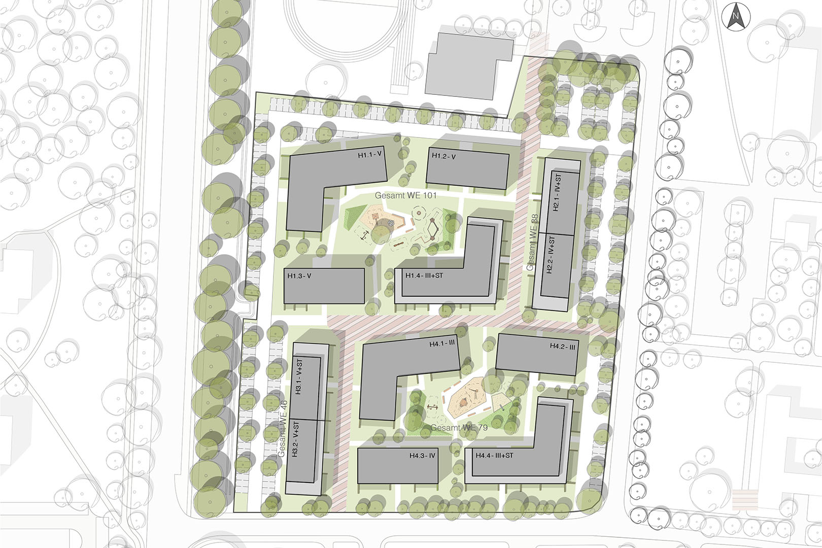 Als Ergebnis entsteht ein abwechslungsreicher innerer Grünraum, der gleichzeitig zur fußläufigen Durchquerung des Quartiers genutzt wird. Damit können die bestehenden Verbindungen von der Möllner Straße zu den Schul- und Sportflächen im nördlich angrenzenden Gebiet erhalten und aufgewertet werden (inkl. Erhalt des Baumbestandes). An zentraler Stelle entsteht ein 9-geschossiger städtebaulicher Höhepunkt als Standortmarke. Er ist der Dreh- und Angelpunkt des neuen Quartiers. ln den grünen Höfen können individuelle Mietergärten entstehen, aber auch Gemeinschaftsgrünflächen entlang der zentralen Grünachse. Anschließend an diese Achse entsteht im südlichen Bereich ein Kleinkinderspielplatz (gut von der umgebenden Bebauung einsehbar). Ln der größeren zusammenhängenden Grünfläche vor der Westfassade des Hochhauses könnte eine interessante Spielfläche für die Altersgruppe 7-13 Jahren entstehen.